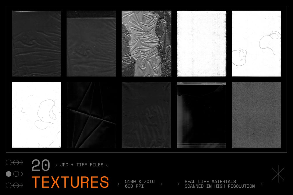 INCLUDES 20 TEXTURES: Provided as .JPG and .TIFF files, these textures are all high-resolution (600 PPI) files. Perfect for giving your designs that final touch.