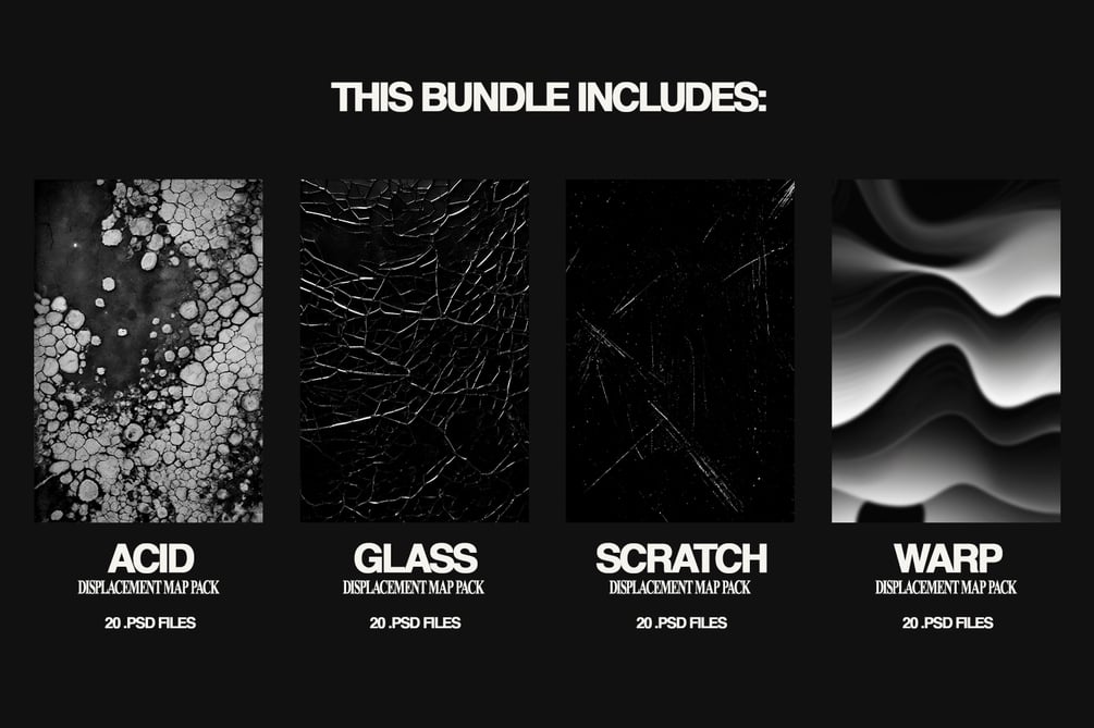 80 displacement map .PSD files (20 from the ACID, GLASS, SCRATCH, and WARP packs)
