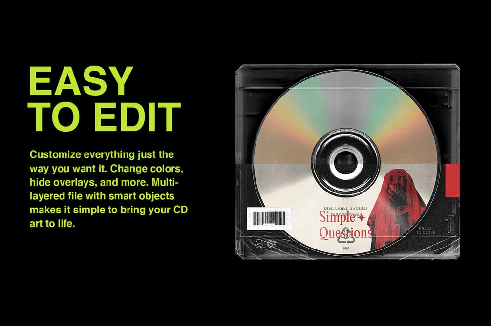 Quickly and easily bring your design to life with this high resolution CD mockup. Made from real scans of CDs and CD cases, simply edit smart objects and show/hide layers to customize the look of this mockup to your liking.