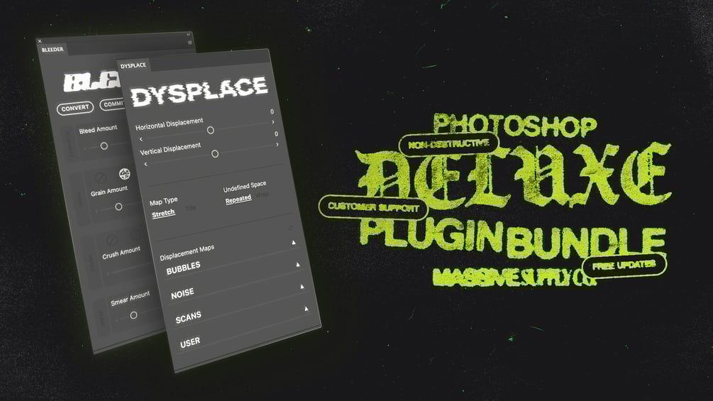 Get access to two incredibly powerful Photoshop plugins and see instant results in your design workflow. With DYSPLACE and BLEEDER, you'll get instant access to non-destructive displacement and ink bleed effects in Photoshop. You're not going to find a better deal on these plugins.